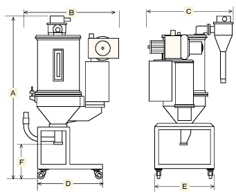 ●仕込量はABSペレット見掛比重0.7を基準にしています。ドライヤーの選定は1時間の使用量の約3倍を目安にして選定してください。